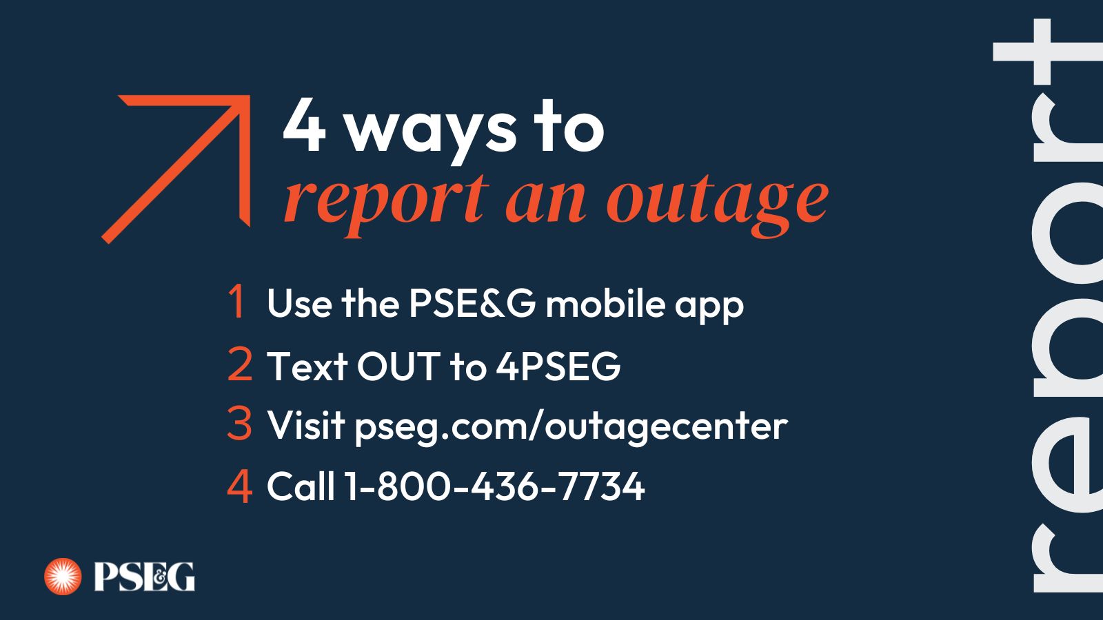 - Report an outage and receive status updates by texting OUT to 4PSEG (47734). You can also report your outage through our app or on our website at pseg.com/myaccount.